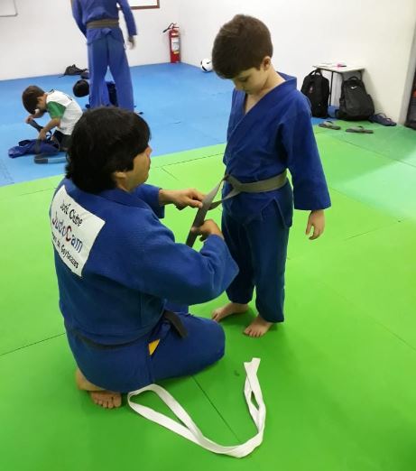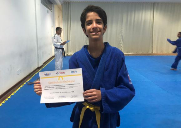 Vítor Fraga de Oliveira aluno do professor Manoel Leandro que treina no Centro de Treinamento do Tênis Club de Campos recebeu do professor Francisco de Alvarenga Leandro sua nova graduação a Faixa Amarela.