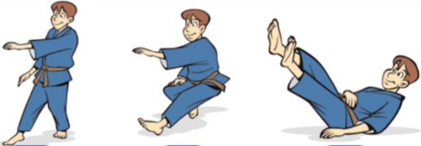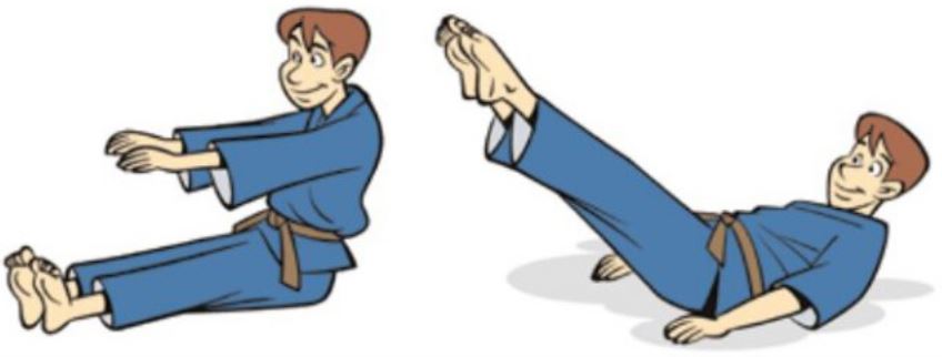 1º Ukemi - Senta com as pernas e braços esticados para frente, com as palmas das mãos para baixo, inicia-se deitando o corpo e batendo os braços ao lado do corpo com mais ou menos 45 graus de afastamento do corpo, a cabeça não pode encostar no tatame e a perna sobe para que fico como se fosse um angulo de 90 graus.