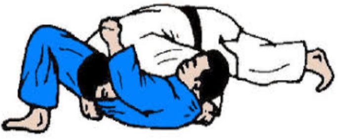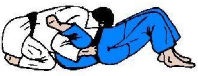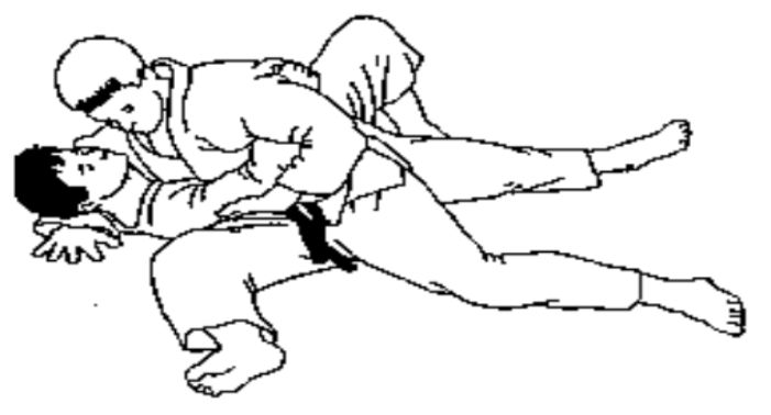 Primeira imobilização, sente ao lado do uke (adversário), abrace o pescoço do adversário e prenda o braço do adversário na sua axila. Perna da frente fica próxima a cabeça do adversário com mindinho no chão, perna de trás, dedão e joelho encostados no chão. A outra mão fica abaixo da cabeça do adversário espalmada no tatame.