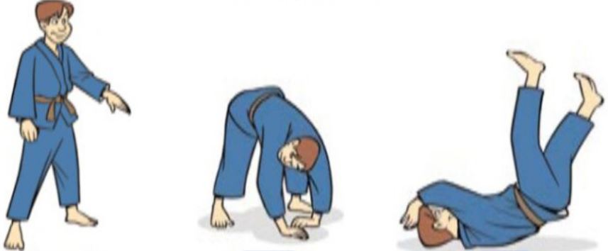 3º Ukemi - Fica de pé com as pernas abertas o máximo que puder, os braços dobrados em 90º graus à frente do corpo com as palmas das mãos abertas viradas para frente, flexiona a cervical para frente deixando o corpo cair ficando apoiados nas pontas dos pés com os cotovelos e as palmas das mãos espalmadas no tatame.
