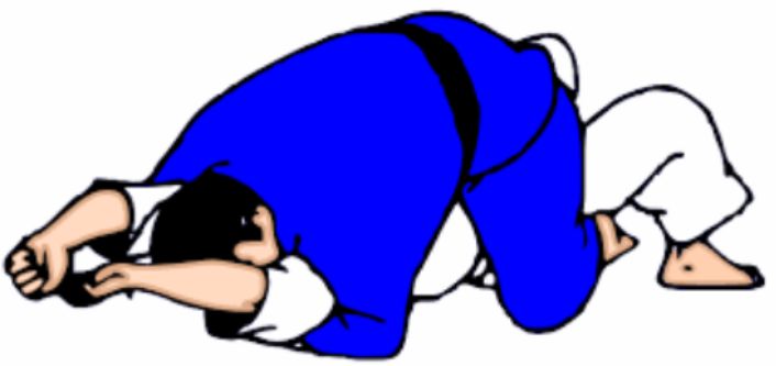 4º Ukemi - Fica de pé, dá um pulo abrindo as pernas o máximo que puder com os braços dobrados em 90º graus à frente do corpo com as palmas das mãos abertas viradas para frente, flexiona a cervical para frente deixando o corpo cair ficando apoiados nas pontas dos pés com os cotovelos e as palmas das mãos espalmadas no tatame