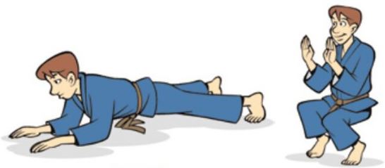 2º Ukemi - Fica de joelhos com os pés vivos (parte de trás dos dedos apoiados no tatame) e com os braços dobrados em 90º graus à frente do corpo com as palmas das mãos abertas viradas para frente, após isto, deixe seu corpo cair para frente ficando apoiados nas pontas dos pés sem encostar os joelhos e barriga e com os cotovelos e as palmas das mãos espalmadas no tatame.